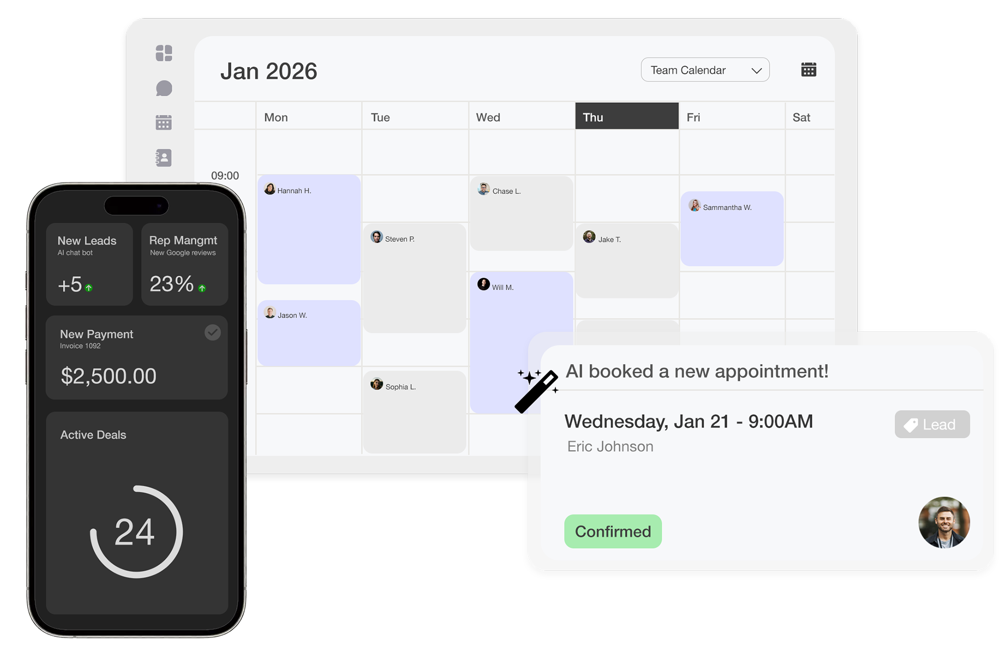 It replies to new leads, answers questions, and books appointments across every channel.